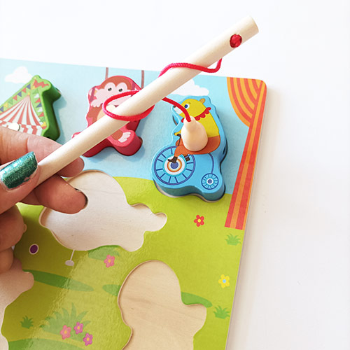 این بازی چوبی فکری از یک صفحه در ابعاد 2 در 18 به شکل یک پازل در طح های مختلف ساخته شده.یکی از ویژگیهای این پازل این است که کودکان از 1/5 سالگی می توانند با جاگذاری پازل شروع کنند و چون قطعات پازل برجسته و درشت است کودک به راحتی می تواند در دست بگیرد. بعد از این مرحله می تواند با قلاب آن تکه های پازل را بردارد و جایگذاری را انجام دهد . و در نهایت بعد از سه سالگی از قسمت نخ کردنی کردنی می تواند استفاده کند.